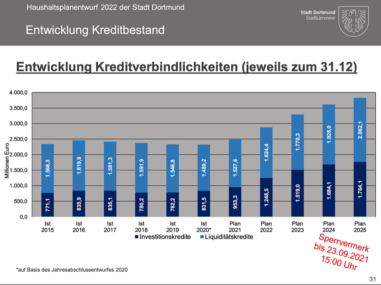 Der Schuh allerdings, der drückt eigentlich woanders, nicht nur in Dortmund: Die Befürchtung in vielen Kommunen NRWs: dass das Gemeindefinanzierungsgesetz, das ausläuft, zukünftig nicht entsprechend ausgestattet würde, so Stüdemann. „Unglücklich“ nennt er das – wie gewohnt vorsichtig. Denn dadurch wären niedrigere Schlüsselzuweisungen zu befürchten. Schlussendlich hieße dies: Die Stadt bliebe auf von politisch woanders beschlossenen Kosten sitzen. Ganz abgesehen von ihren Altschulden, die sie niemals aus eigener Kraft wird abbezahlen können.