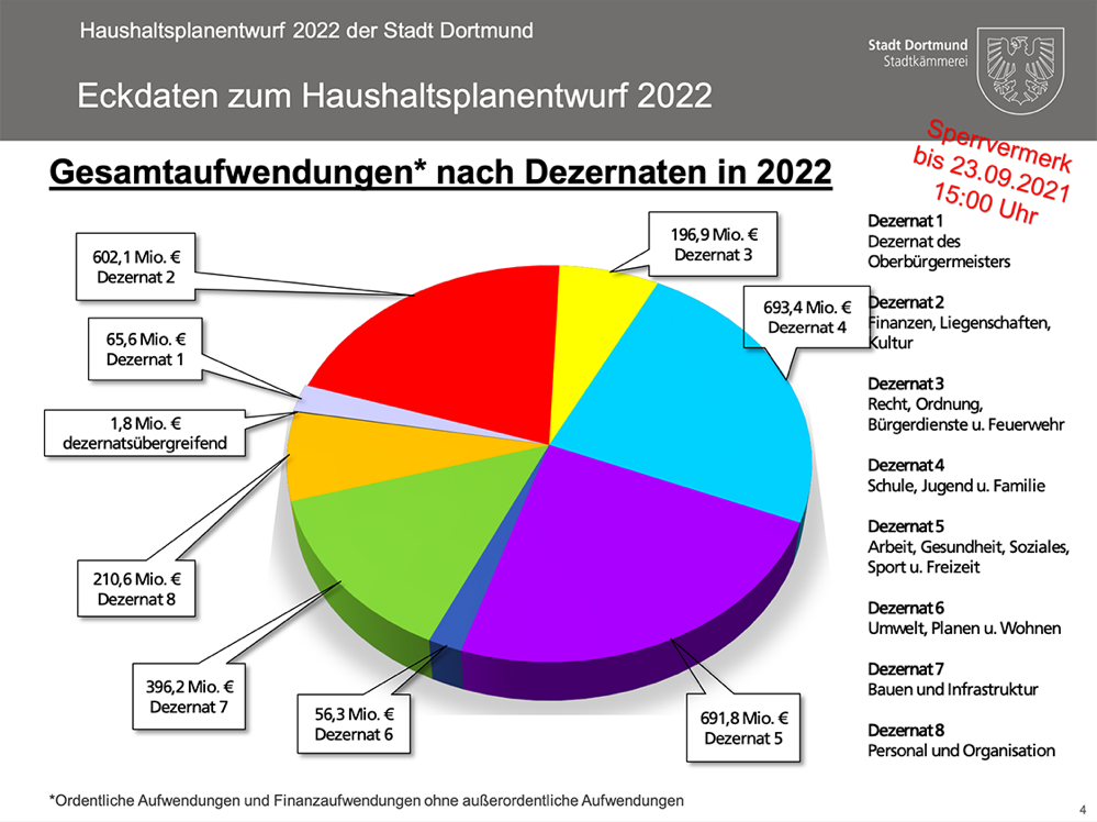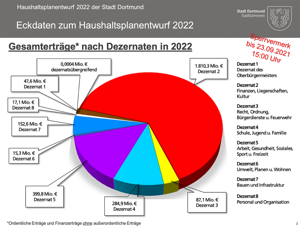 Ein zufrieden wirkender Kämmerer hat am Donnerstag (23. September 2021) seinen Entwurf für den Haushaltsplan 2022 im Rat der Stadt Dortmund präsentiert. Gewiss, es sind schwierige Zeiten. Corona und seine Bekämpfung haben Spuren hinterlassen. Angesichts dessen kommt Jörg Stüdemann nicht umhin, in seinem Entwurf „eine gewisse Dialektik“ verbaut zu sehen. Das Volumen des Haushalts beträgt für das kommende Jahr rund 2,9 Milliarden Euro.