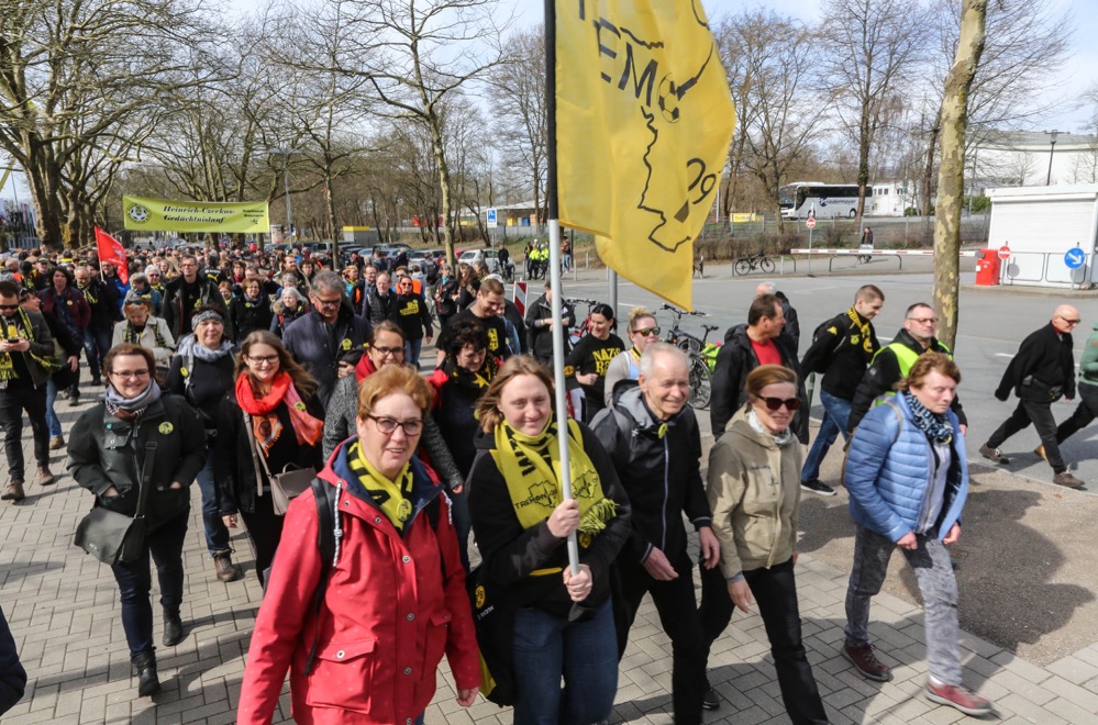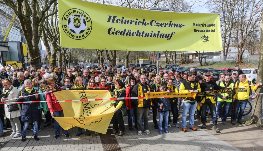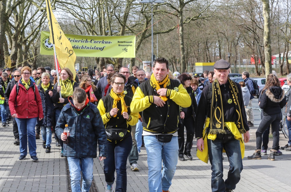 Begünstigt durch das schöne Wetter kamen über 1.200 Teilnehmerinnen und Teil-nehmer zum Lauf. Gut versorgt mit Waffeln, Kaffee und Kaltgetränken machte sich um 13 Uhr die größte Gruppe an den Start. Die Wanderer- und Fußgängergruppe wurde diesmal durch die beiden BVB-Legenden Dede und, zum 10. Mal bereits, durch Sigi Held auf den 7km langen Weg durch die Bolmke, den Rombergpark in die Bittermark geschickt. Dort ist Heinrich Czerkus mit etwa 300 Zwangsarbeitern aus Frankreich, Belgien, Polen, den Niederlanden, Jugoslawien und der Sowjetunion und deutschen Widerstandkämpfern in den letzten Kriegstagen ermordet und begraben worden. Um 13.30 folgte die Gruppe der etwas schnelleren Walker und um 14 Uhr eine, diesmal außergewöhnlich große Gruppe an Joggern und Radlern