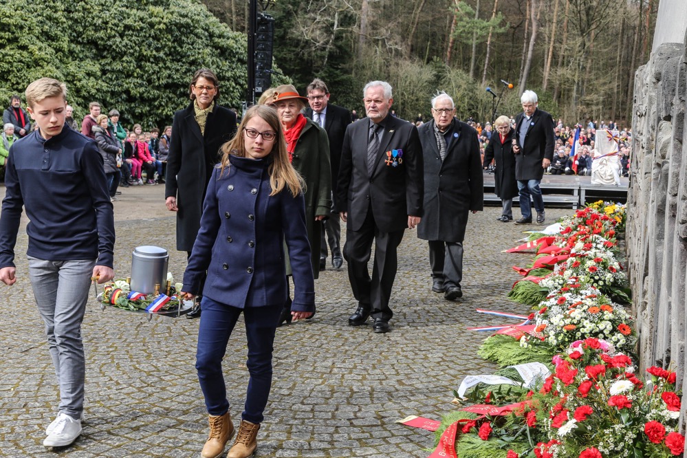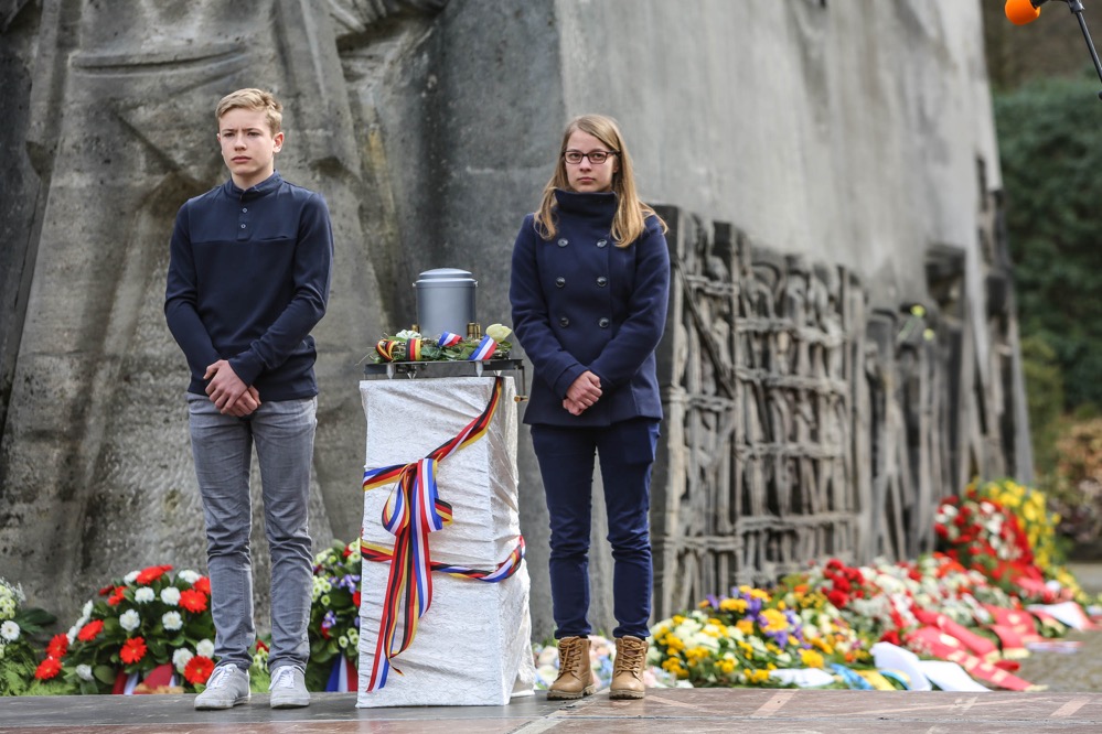 Während der Mahnfeier tragen zwei junge Europäer aus Frankreich und Deutschland gemeinsam die Erde in die Krypta. Erde symbolisiert Verbundenheit. Sie zu tauschen: Freundschaft und Solidarität.