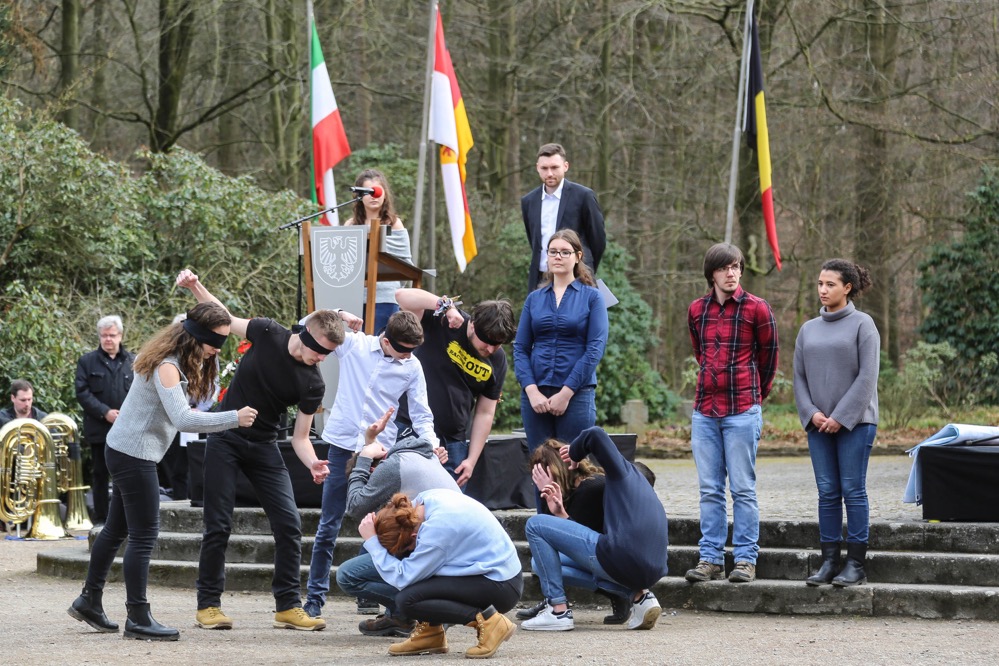 Moderiert wurde die Gedenkveranstaltung von den BotschafterInnen der Erinnerung und mitgestaltet von einer Gruppe elf junger Franzosen, die in der Karwoche gemeinsam mit den BotschafterInnen ein Programm erarbeitet hatten. TeilnehmerInnen des Heinrich-Czerkus-Gedächtnislaufs legten nach ihrer Ankunft in der Bittermark einen Kranz nieder.