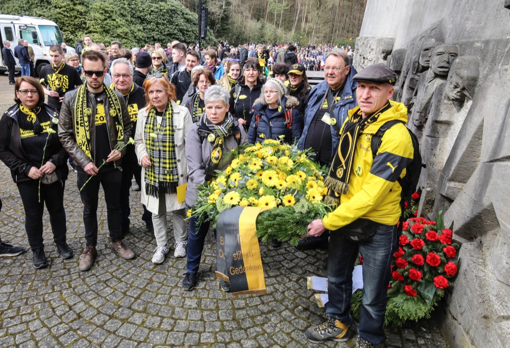 Am Mahnmal für die Ermordeten in der Bittermark legten die Teilnehmerinnen und Teilnehmer des Laufes den vom BVB bereitgestellten Kranz und 50 gelbe Nelken nieder. Anschließend begann die Gedenkveranstaltung der Stadt Dortmund