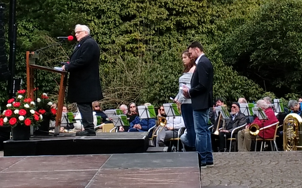 Bürgermeisterin Birgit Jörder ergänzt moderat, dass besonders heute, in Zeiten des Zulaufs für Rechtspopulismus und Nationalismus in Europa, wir uns unserer Verantwortung stellen und für ein freies, solidarisches und demokratisches Europa eintreten müssten.
