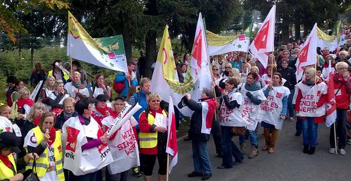 Über 2.200 Streikende bei der AWO in NRW - Freitag zentrale Streikkundgebung in BochumÜber 2.200 AWO-Beschäftigte haben sich am Donnerstag am landesweiten Warnstreik beteiligt. Kitas blieben geschlossen, in Senioren- und Pflegeeinrichtungen wurde im Notbetrieb gearbeitet. „Das ist eine klare Antwort der Beschäftigten auf Provokation der Arbeitgeber in der letzten Verhandlungsrunde“, so ver.di-Verhandlungsführer Wolfgang Cremer. Dort hatten die Arbeitgeber als Voraussetzung für weitere Verhandlungen eine Schlechterstellung der ErzieherInnen gegenüber der Altenpflege und den übrigen Sozialbereich gefordert. „Die Arbeitgeber sollten von diesem Irrweg ablassen und zu sachlichen und fairen Verhandlungen zurückkommen“, so der Gewerkschafter.