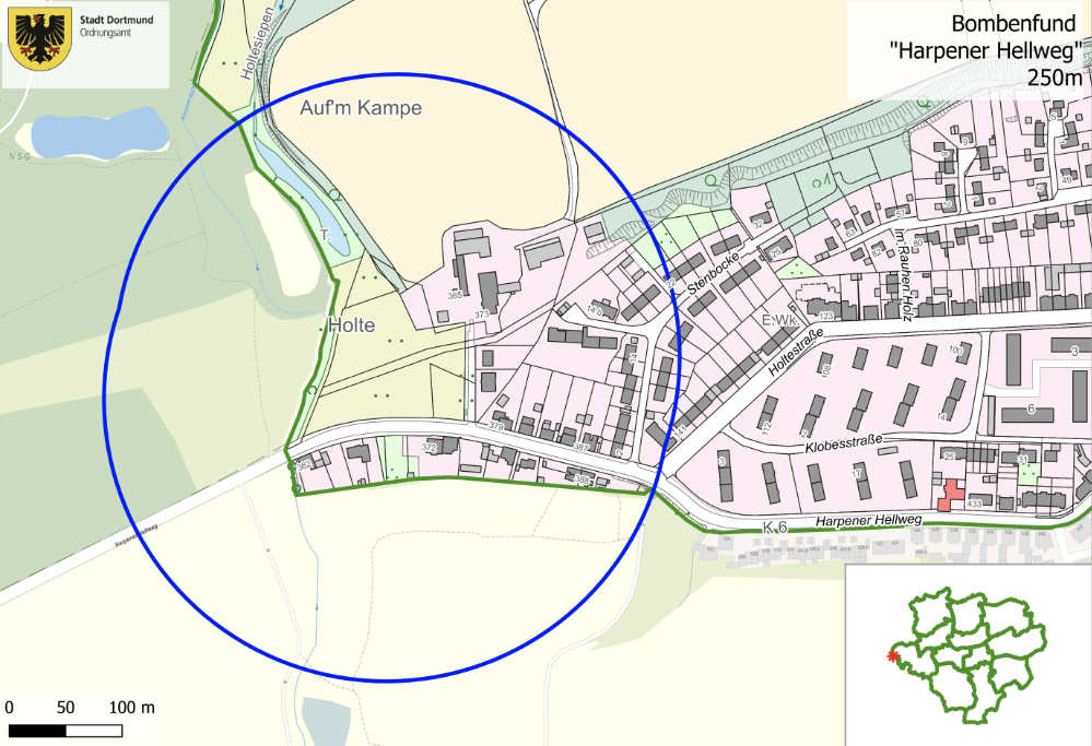 Am Harpener Hellweg in Dortmund, nahe der Grenze zu Bochum, sind am Vormittag zwei weitere amerikanische 250-Kilogramm-Blindgänger aus dem Zweiten Weltkrieg entdeckt worden. Diese wird der Kampfmittelbeseitigungsdienst der Bezirksregierung Arnsberg heute noch entschärfen. Zur Sicherheit wird das umliegende Gebiet in einem Radius von 250 Metern ab circa 14 Uhr evakuiert.