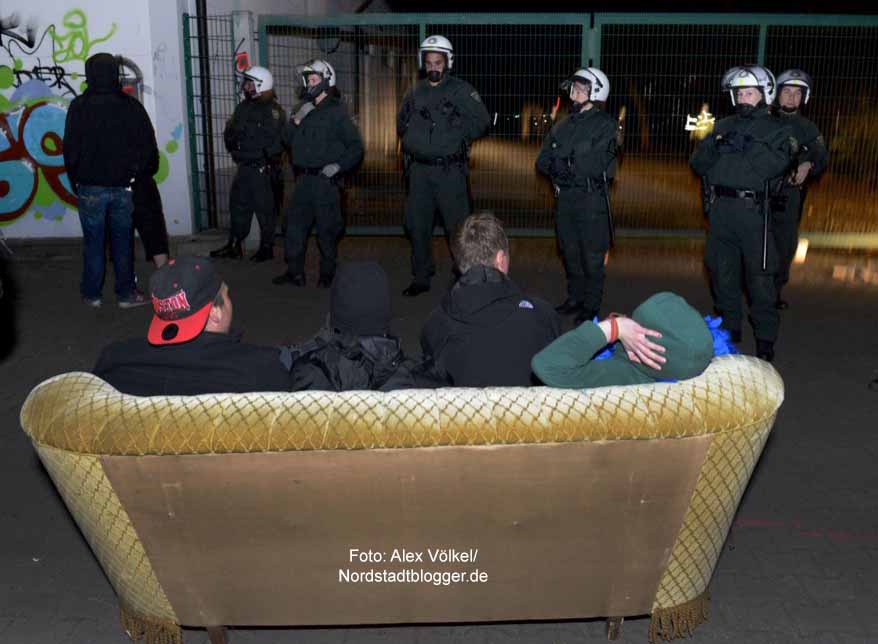 Mehr als „tiefenentspannt“ zeigten sich die Beamten. Selbst durch provozierende Sprüche und Sprechchöre ließen sie sich nicht provozieren. Selbst als Aktivisten ein Sofa anschleppten, vor den Polizisten aufstellten und sich lässig vor ihnen niederließen, gab es keine Reaktion. Die Aktionen liefen absolut friedlich ab.