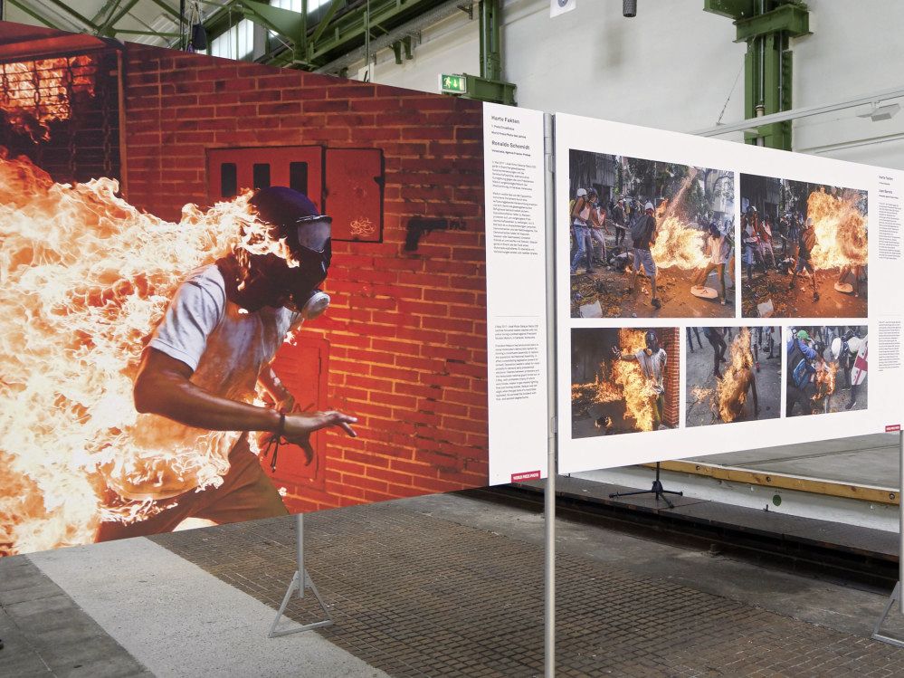 Nur wenige Schritte vom Eingang der Ausstellung entfernt steht das World Press Photo des Jahres 2018 von Ronaldo Schemidt, „Venezuela Crisis.“ Darauf: Ein Mann mit Gasmaske, der in Flammen steht. Es ist der 28-jährige José Víctor Salazar Balza, Protestant gegen Venezuelas Staatspräsidenten Nicolás Maduro.