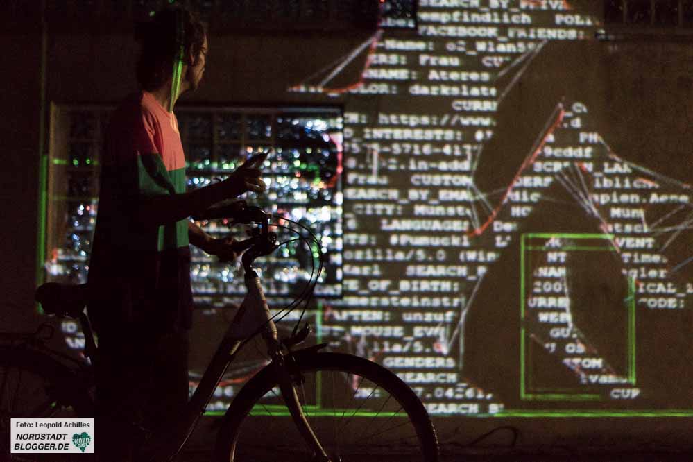 Mittels Motion-Tracking Kameras und Projektoren wurden die Körper der Menschen als schemenhafte Lichtbilder bestehend aus Daten an die Wände des Gebäudekomplexes gestrahlt.