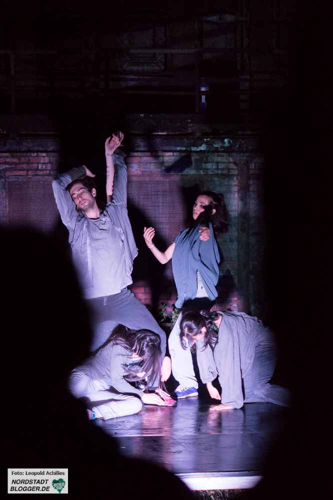 Als Highlight und Abschluss des Programms der Kokerei gab es zwei Mal am Abend eine Live-Performance auf der Druckmaschine von „Aaron.St“ und „Smart part of art“, die ebenfalls an eine Lichtshow gekoppelt wurde und Tanz mit Live Musik verband.